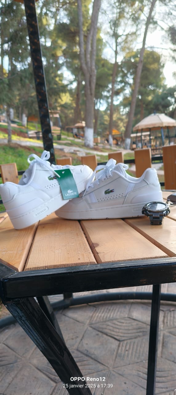 Chaussure de sport *Lacoste* au design élégant et aux couleurs modernes, combinant le blanc et le bleu. Fabriquée avec des matériaux de haute qualité pour offrir confort et style à chaque pas. Parfaite pour un look casual et quotidien.